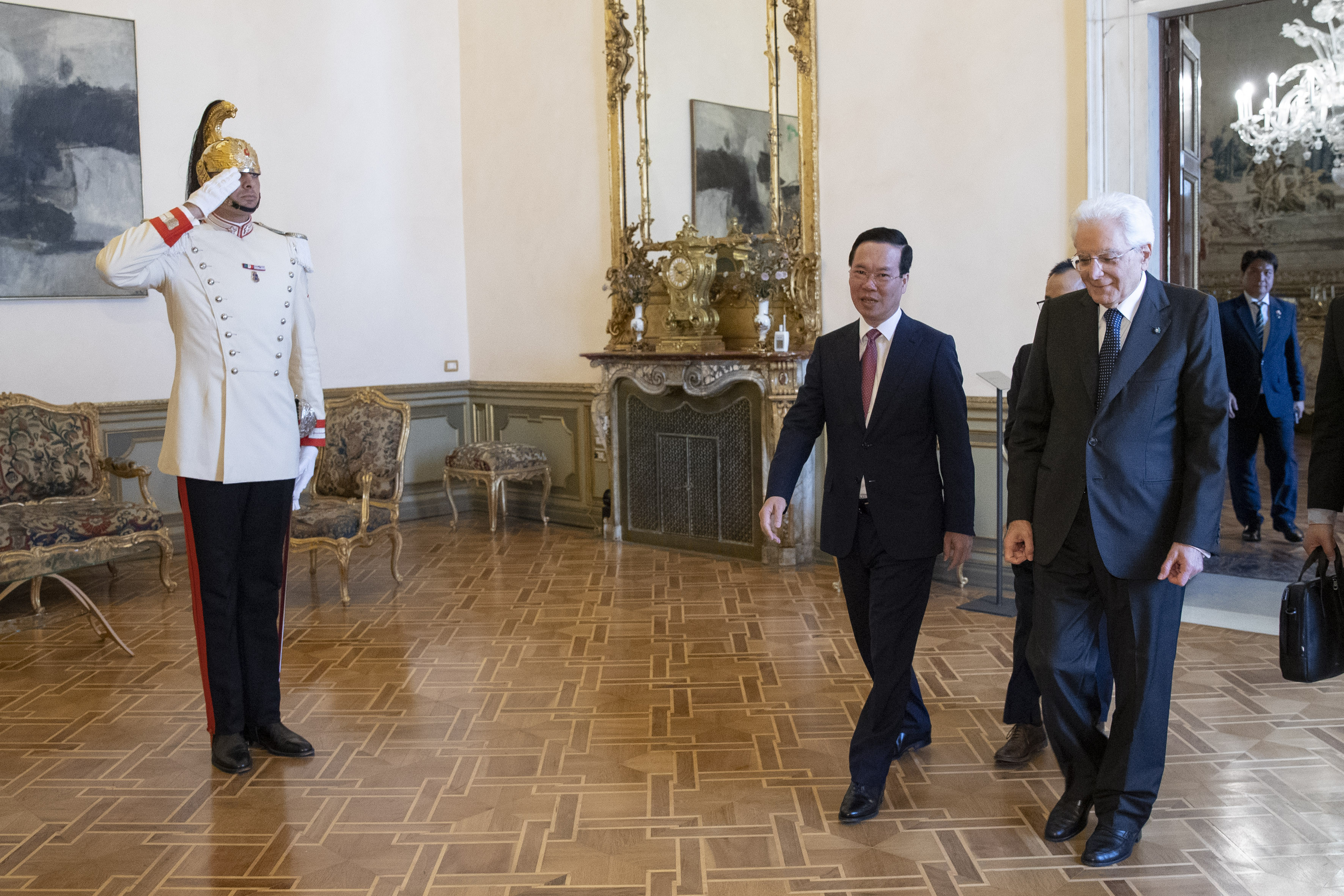 Lãnh đạo Bộ Ngoại giao Italia đón Chủ tịch nước Võ Văn Thưởng và phu nhân tại nơi đỗ xe, mời Chủ tịch nước lên Phòng Brustolon. Tổng thống Sergio Mattarella và con gái mời Chủ tịch nước Võ Văn Thưởng và phu nhân vào phòng, bắt đầu các nghi thức của buổi lễ.