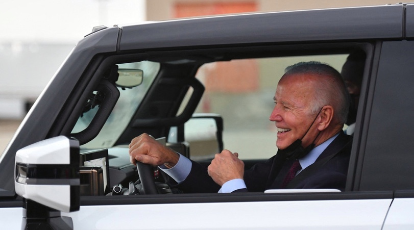 Tổng thống Mỹ Joe Biden đã thể hiện kỹ năng lái xe trên một chiếc ôtô Hummer mới, chạy hoàn toàn bằng điện, tại sân sau của nhà máy General Motor.