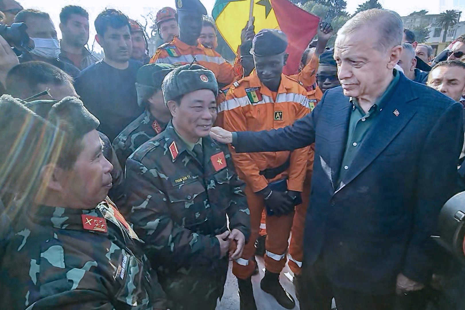 Tổng thống Erdogan cảm ơn sự hỗ trợ kịp thời của Việt Nam khi bắt tay Thiếu tướng Phạm Văn Tỵ, Phó chánh Văn phòng Thường trực Ủy ban Quốc gia ứng phó sự cố, thiên tai và tìm kiếm cứu nạn, Phó cục trưởng Cục Cứu hộ cứu nạn (Bộ Tổng Tham mưu QĐND Việt Nam), Trưởng đoàn QĐND Việt Nam.