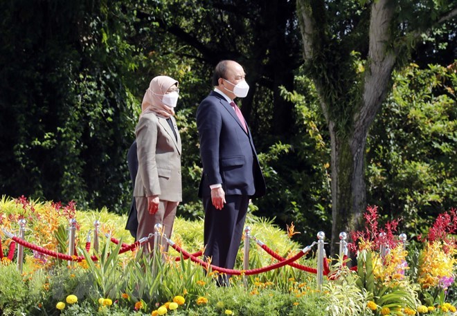 Tổng thống Singapore Halimah Yacob đón Chủ tịch nước Nguyễn Xuân Phúc thăm cấp Nhà nước tới Singapore. Ảnh: Thống Nhất/TTXVN |