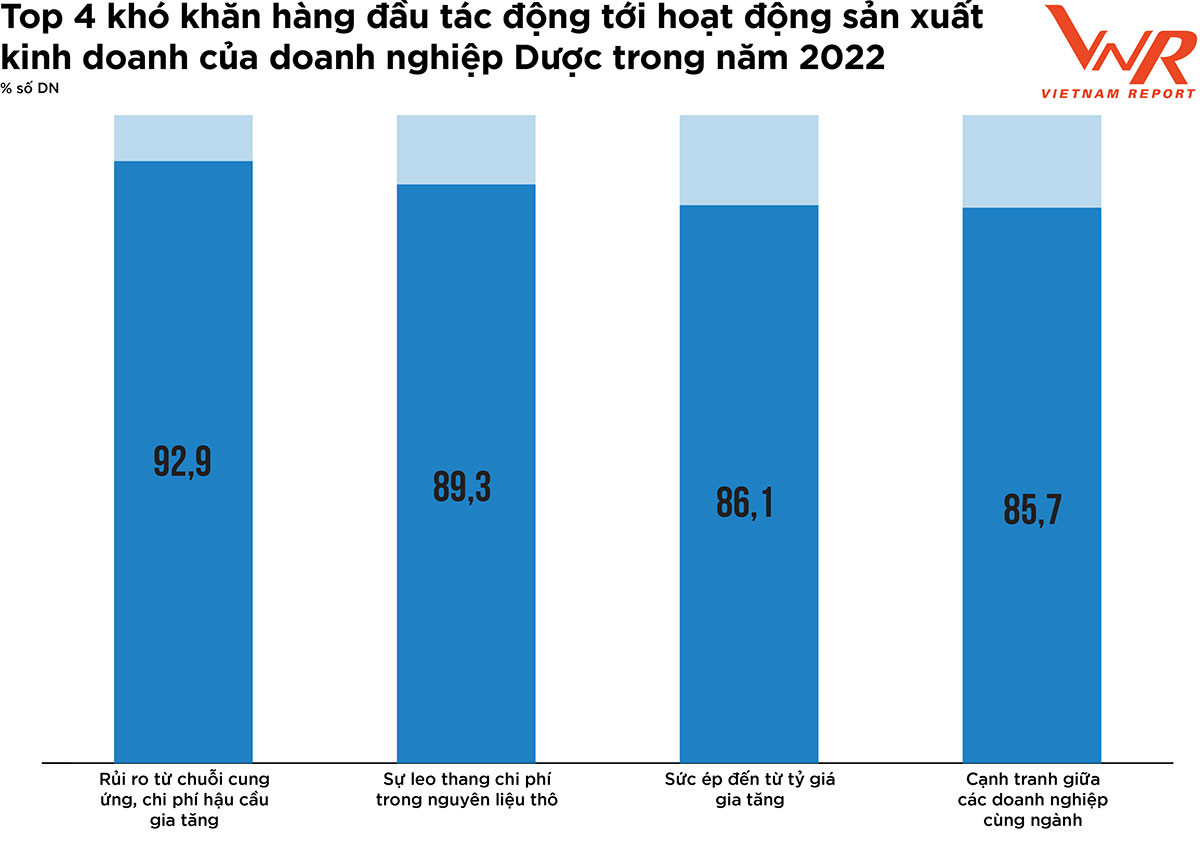 Trong bối cảnh thế giới có nhiều biến động, xung đột Nga – Ukraine kéo theo khủng hoảng năng lượng và nhiều nền kinh tế lớn đang rơi vào suy thoái, kinh tế trong nước cũng liên tiếp gặp nhiều cú sốc, ảnh hưởng đến tâm lý nhà đầu tư, doanh nghiệp và người tiêu dùng, ngành dược phẩm cũng chịu tác động không nhỏ. Khảo sát của Vietnam Report cho thấy, top 4 thách thức ảnh hưởng tới hoạt động sản xuất kinh doanh của các doanh nghiệp trong ngành bao gồm: rủi ro từ chuỗi cung ứng, chi phí hậu cần gia tăng; cạnh tranh giữa các doanh nghiệp trong ngành; sự leo thang chi phí nguyên liệu thô; và sức ép từ tỷ giá gia tăng.