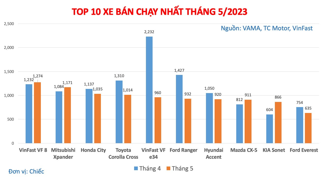 Dưới đây là xếp hạng 10 mẫu xe có doanh số cao nhất nhất tháng 5/2023: