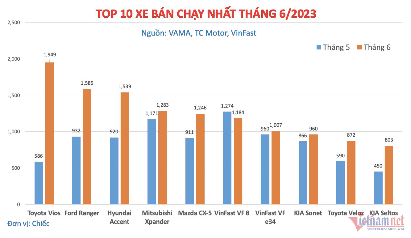 Ở top những xe có doanh số cao nhất tháng, mẫu xe từng bán chạy nhất năm 2022 tại thị trường Việt Nam là Toyota Vios đã "tìm lại chính mình" với doanh số gần 2.000 chiếc, bất ngờ vươn lên vị trí dẫn đầu. Trước đó, trong tháng 5, mẫu sedan cỡ B này chỉ bán ra được vỏn vẹn chưa đến 600 chiếc và "mất hút" khỏi top 10.