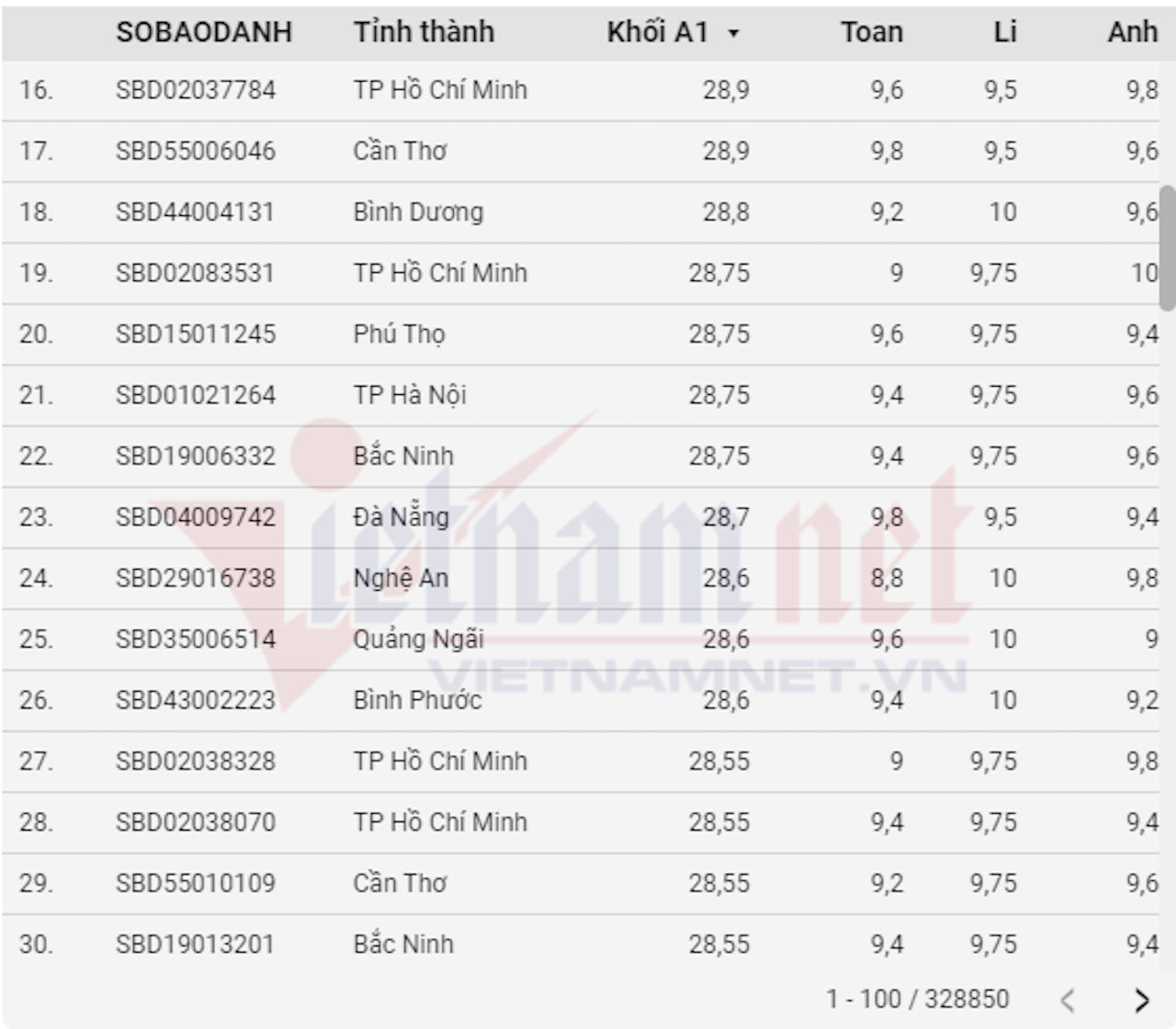 100 thí sinh có điểm khối A1 cao nhất do VietNamNet thống kê: