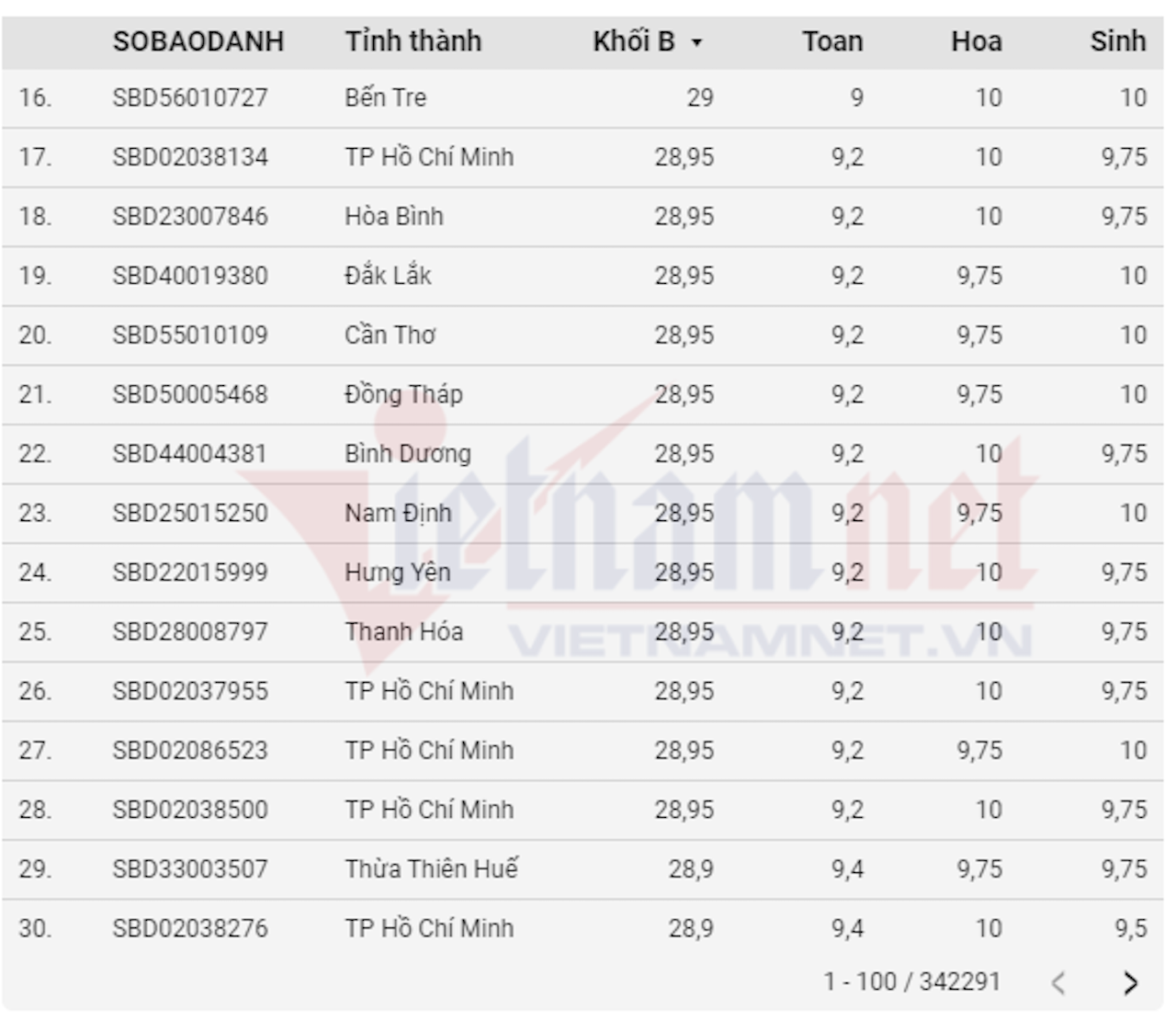 Sau đây là 100 thí sinh có điểm khối B cao nhất do VietNamNet thống kê: