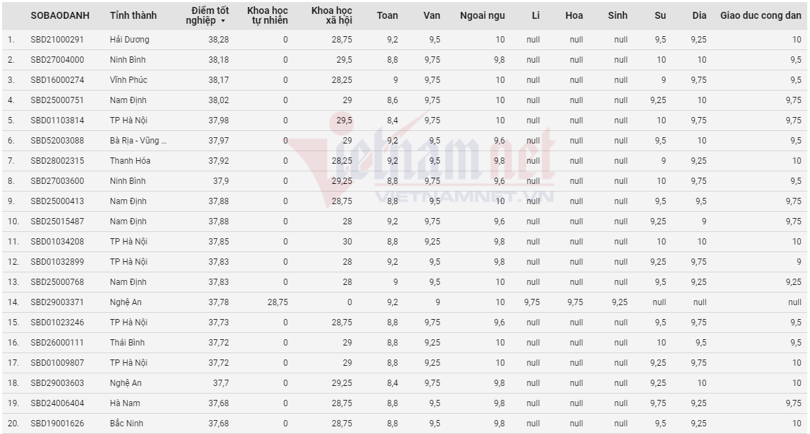 Sau đây là 100 thí sinh có điểm thi tốt nghiệp THPT cao nhất 2024 do VietNamNet thống kê: