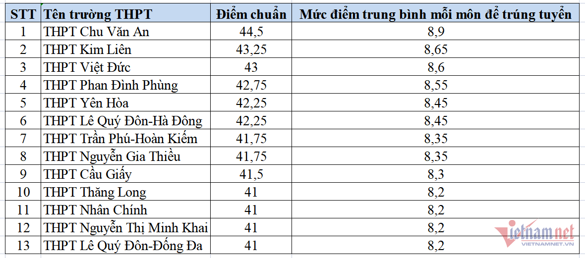 Theo mức điểm chuẩn năm 2023 mà Sở GD-ĐT Hà Nội công bố, trong 117 trường THPT công lập không chuyên, có 13 trường có điểm chuẩn từ 41 trở lên, tức là thí sinh phải đạt trung bình mỗi môn 8,2 điểm trở lên.