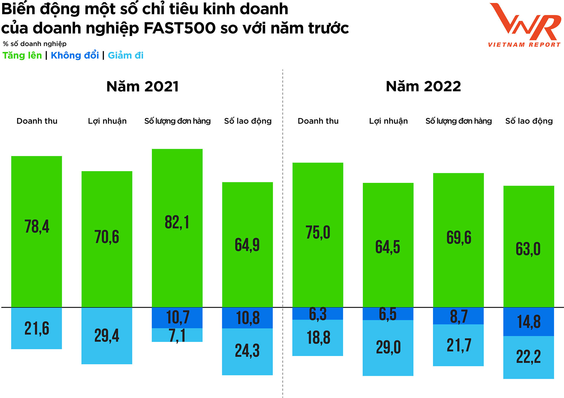 Theo nghiên cứu mới đây của Vietnam Report, 81,3% số doanh nghiệp tham gia khảo sát cho biết vẫn giữ vững được đà tăng trưởng doanh thu trong năm 2022. Khoảng 70% số doanh nghiệp ghi nhận lợi nhuận tăng lên so với năm trước. Tuy nhiên, tỷ lệ tăng lên của doanh thu và lợi nhuận trong giai đoạn 2021-2022 đều thấp hơn so với giai đoạn 2020-2021.