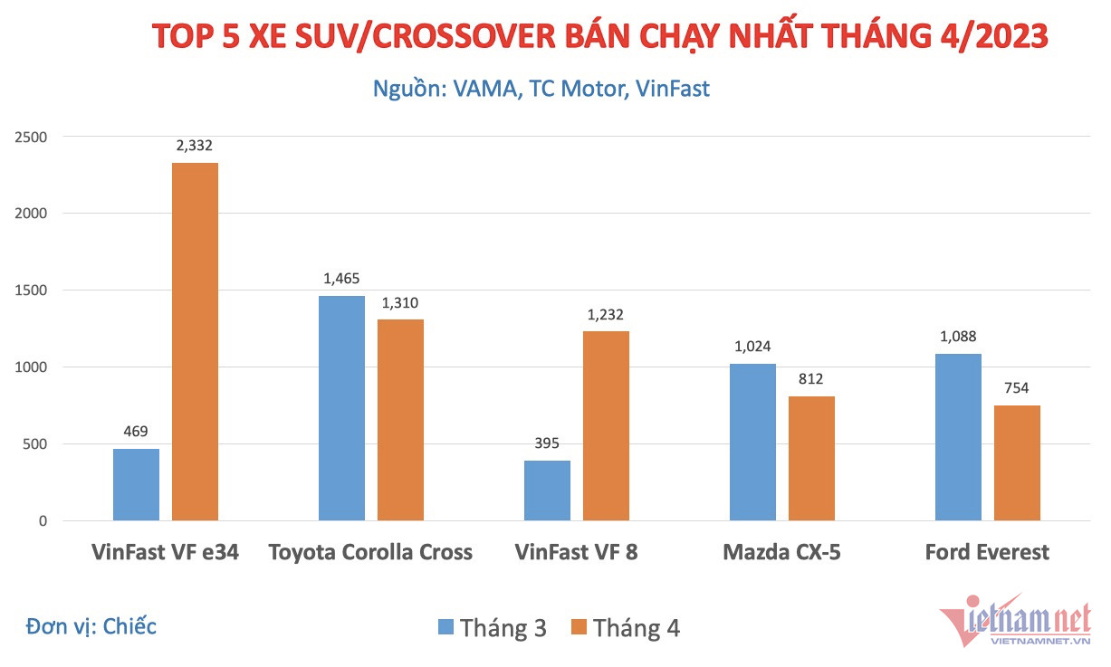 Ở nhóm xe đa dụng (SUV/crossover), VinFast VF e34 bất ngờ có doanh số bán ra hơn 2.300 chiếc, soán ngôi đầu của Toyota Corolla Cross. Đồng thời, mẫu VinFast khác là VF 8 cũng chiếm vị trí thứ 3 trong top xe đa dụng bán chạy với hơn 1.200 chiếc bán ra.