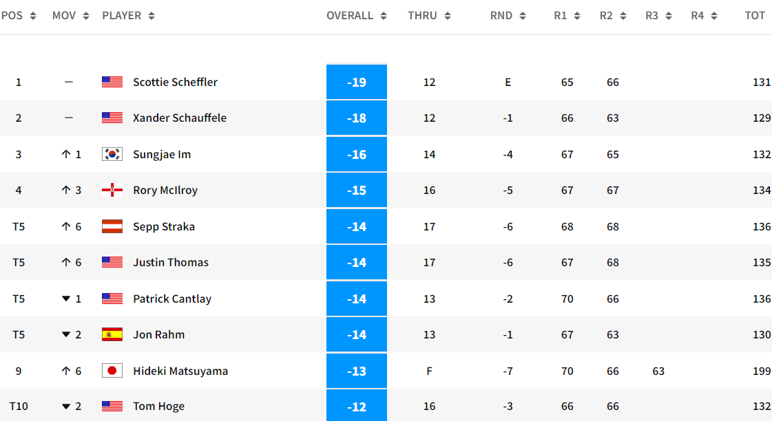 Scheffler hiện vẫn tạm dẫn đầu bảng với tổng điểm -19. Anh còn 6 hố phía trước để có thể cải thiện điểm âm.