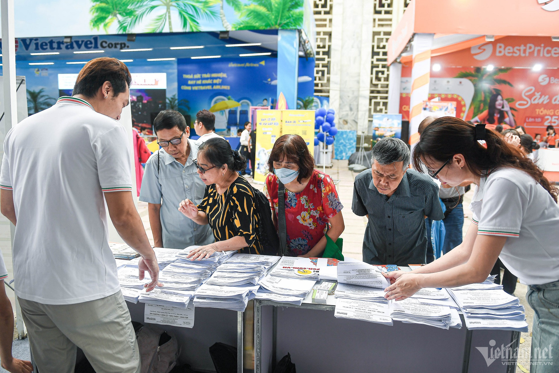 Hội chợ Du lịch quốc tế Việt Nam tại Hà Nội quy tụ 450 gian hàng của hơn 700 đơn vị du lịch, lữ hành trong nước và quốc tế. Thông tin kỳ nghỉ lễ 30/4-1/5 năm nay sẽ kéo dài 5 ngày (gồm hai ngày cuối tuần, một ngày hoán đổi và hai ngày nghỉ chính thức) khiến nhiều du khách tìm tới hội chợ để săn ưu đãi, chốt tour giá tốt cận kề kỳ nghỉ.