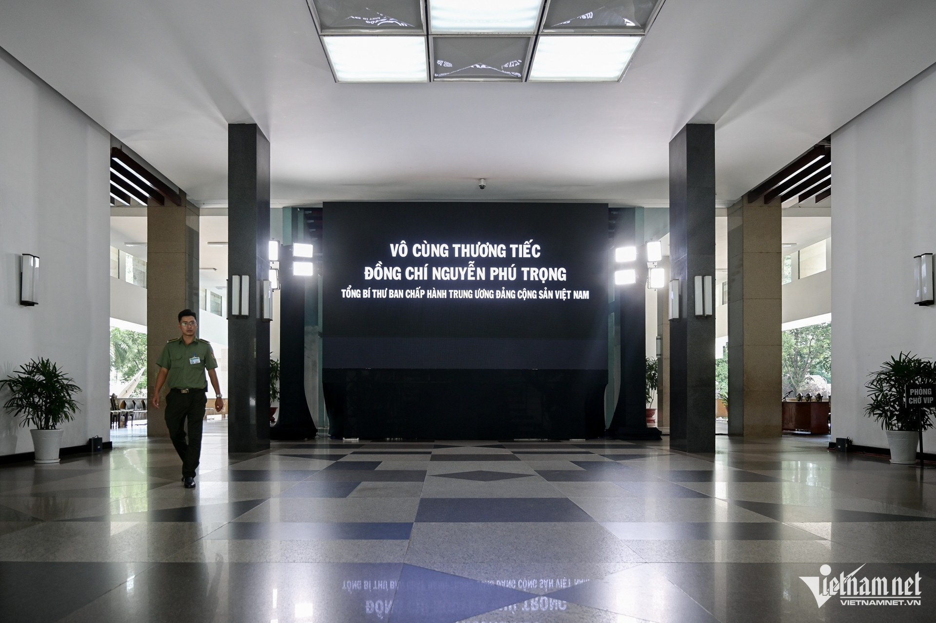 Khu nhà bạt che nắng được bố trí dọc lối vào viếng. Đến trưa 24/7, các công tác chuẩn bị cho lễ tang Tổng Bí thư Nguyễn Phú Trọng được Ban Tổ chức làm việc trên tinh thần khẩn trương, nghiêm trang bằng tình cảm và lòng tiếc thương dành cho nhà lãnh đạo trọn đời vì nước, vì dân.