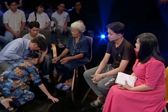 Trong giây phút đoàn tụ đầy xúc động, bà Nhung quỳ gối tri ân người phụ nữ nhặt ve chai vì đã cưu mang đứa con thất lạc hơn 30 năm của mình.