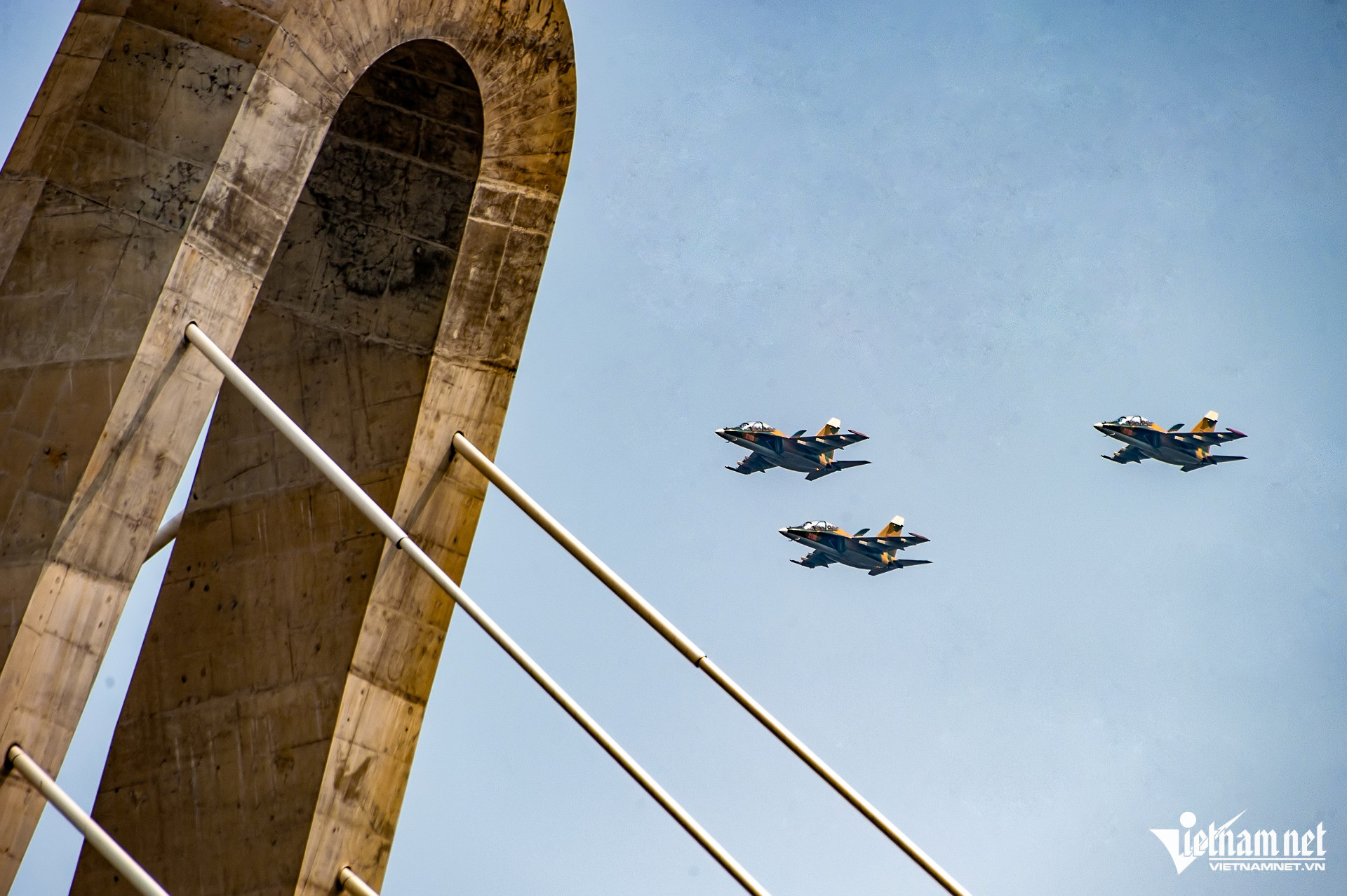 10 trực thăng Mi-8, Mi-17 kéo theo cờ Đảng và cờ Tổ quốc cùng 6 máy bay chiến đấu huấn luyện Yak-130, 7 tiêm kích Su-30MK2 xuất phát từ sân bay Biên Hòa (Đồng Nai) tiến về phía TPHCM vào sáng nay.