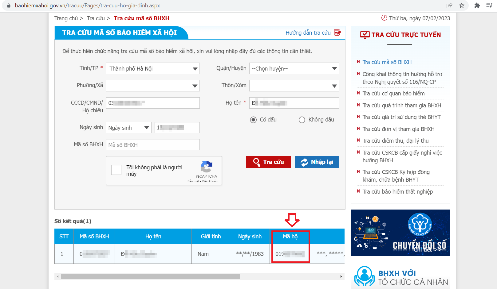 Lưu ý: Những thao tác trên đang sử dụng chức năng tra cứu mã số BHXH. Số sổ hộ khẩu điện tử chỉ là một trong những thông tin kèm theo đối với mỗi cá nhân khi tiến hành tra cứu.