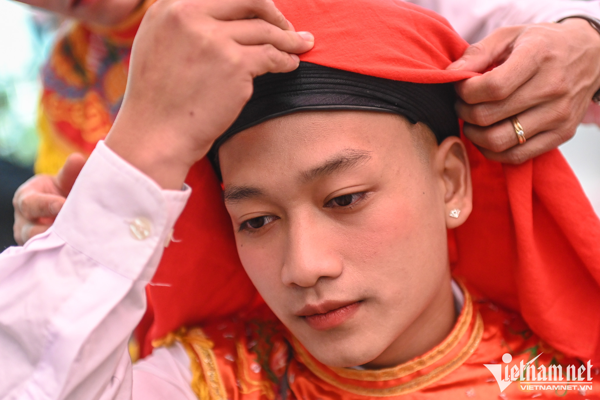 Ngay từ 13h, 18 thanh niên tham gia múa bồng sửa soạn, tô son phấn, xúng xính trong áo tứ thân, váy đụp, đeo bông tai, chít khăn mỏ quạ.