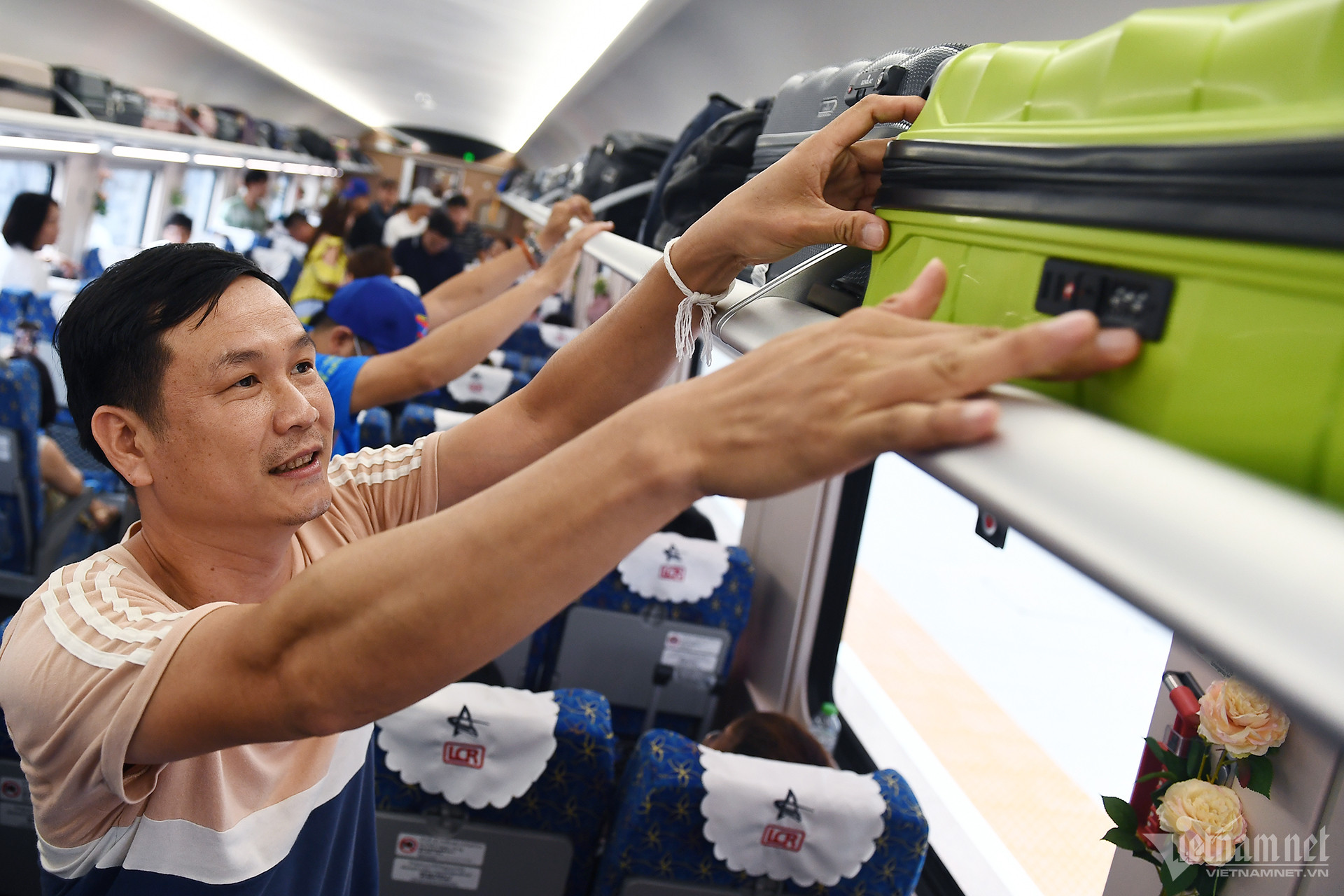 Anh Thế Dự, một người đến từ Việt Nam đang sắp xếp chiếc vali xách tay của mình sao cho gọn vào ngăn chứa hành lý. Khi ngồi trên toa, hành khách tự bảo quản tư trang, vật dụng cá nhân. Các loại túi xách có thể để trên giá hoặc dưới chân. Với các kiện hàng lớn hơn hay vali kéo đã có giá đỡ ở khu vực đầu toa.