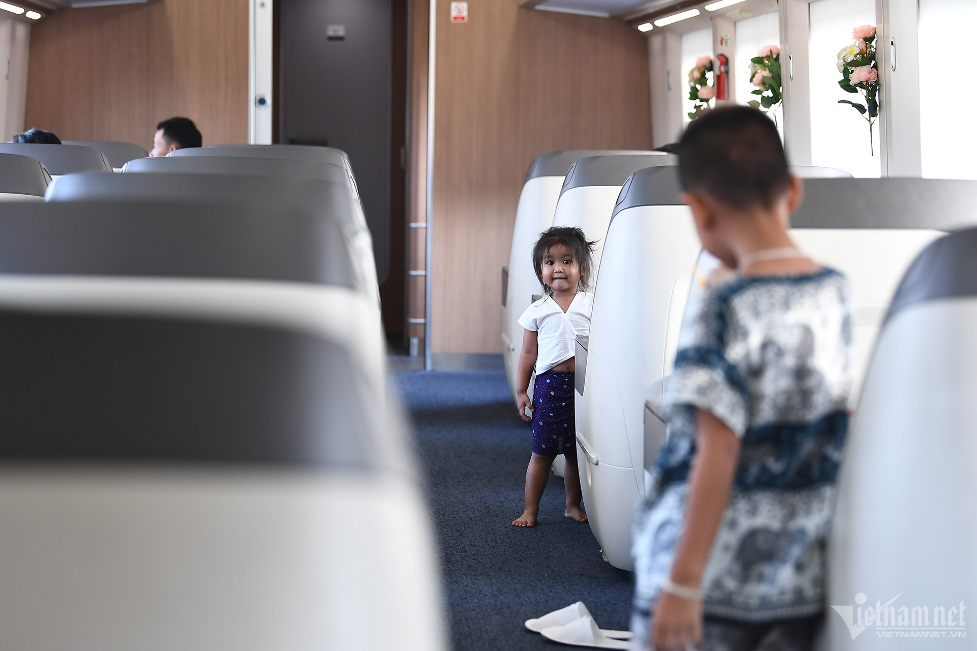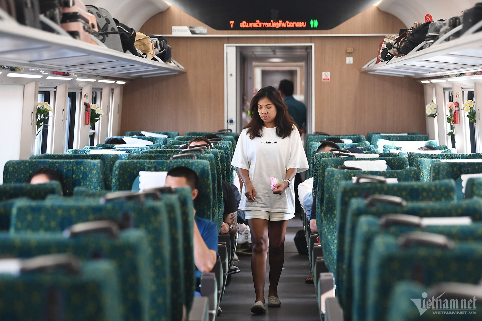 Chặng Luang Prabang - Vang Vieng dài 190km, giá vé khoảng 160.000 đồng, trong khi chặng Vang Vieng - Vientiane dài 130km giá 170.000 đồng/người, di chuyển mất gần một tiếng. Trong ảnh, ghế ở toa hạng nhất được thiết kế giống hạng thương gia trên máy bay.