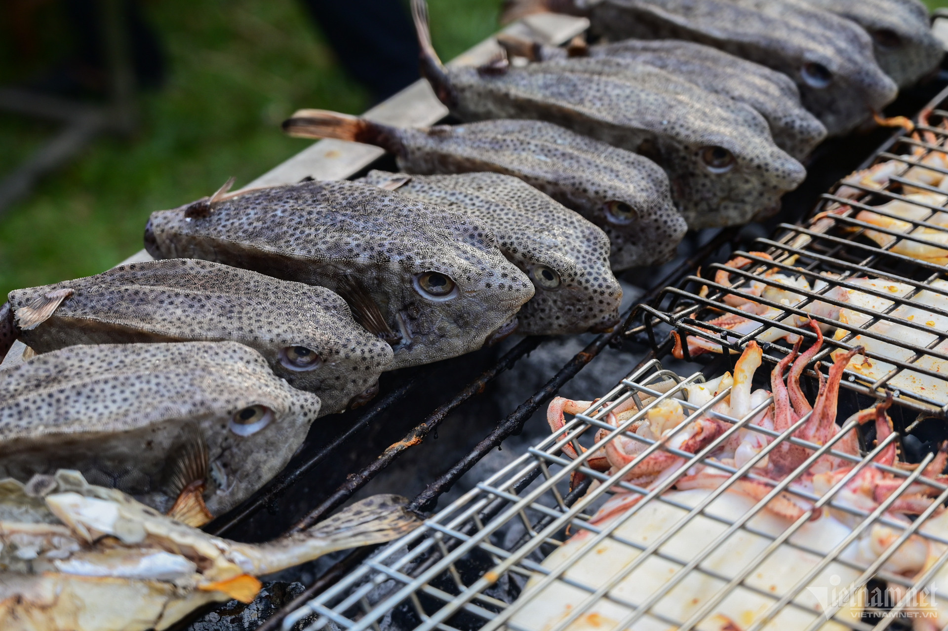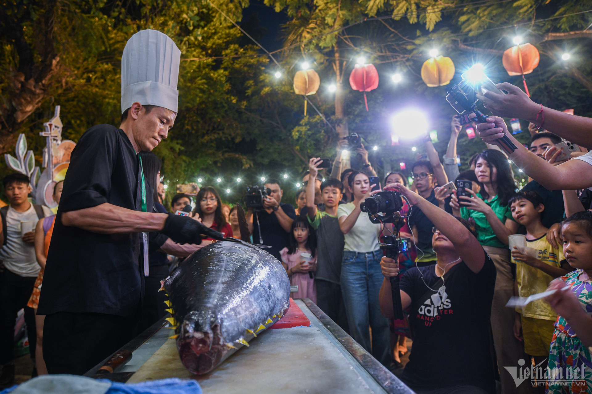 Nhiều món hải sản tươi sống được chế biến ngay tại chỗ như cá bò hòm có hình dạng kỳ dị - một đặc sản tới từ Phan Thiết. Màn biểu diễn chế biến fillet cá ngừ đại dương Phú Yên của bếp trưởng Nguyễn Thiên Hoàng thu hút sự quan tâm của nhiều khách.