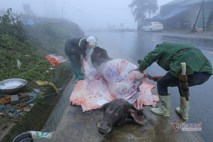 | Một đám mổ trâu ven đường trong không khí mù sương |