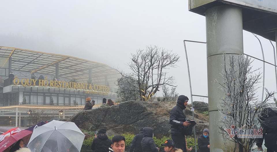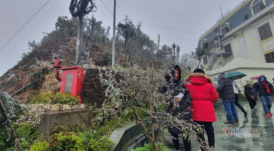 Từ điểm du lịch Thác Bạc (thị xã Sa Pa), du khách nườm nượp đi ngắm cảnh. Các khu đất trống ven chân đèo Ô Quy Hồ, cây cối phủ kín băng đá, trở thành điểm check-in ngoài trời của hàng ngàn người.