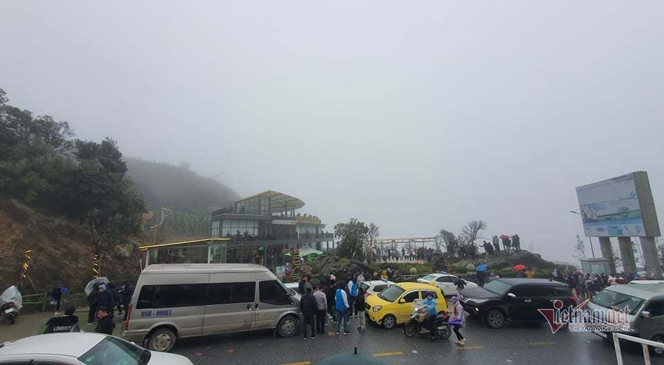 Tại điểm dừng chân trên đỉnh đèo Ô Quy Hồ, cả dòng xe chở khách du lịch dừng đỗ tràn lan.
