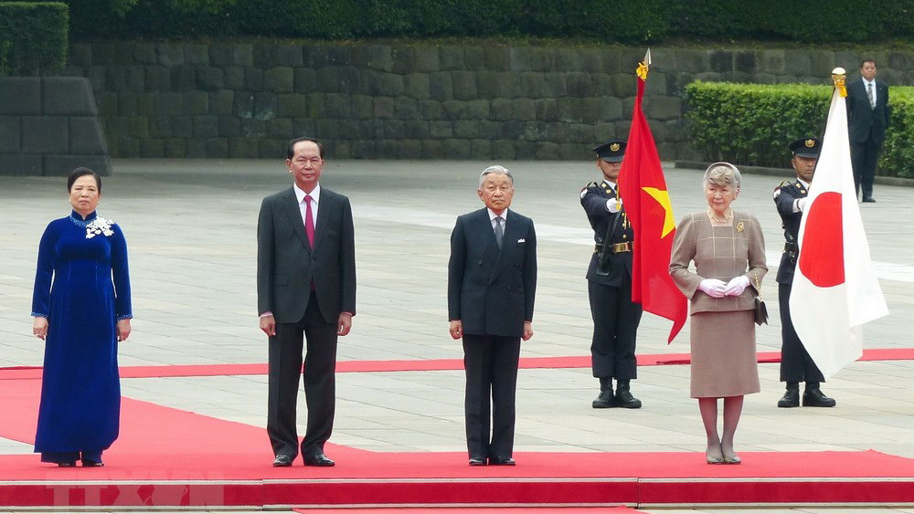 Lễ đón chính thức Chủ tịch nước Trần Đại Quang và phu nhân sang thăm cấp nhà nước Nhật Bản được tổ chức trọng thể tại Cung điện Hoàng gia ở Thủ đô Tokyo.