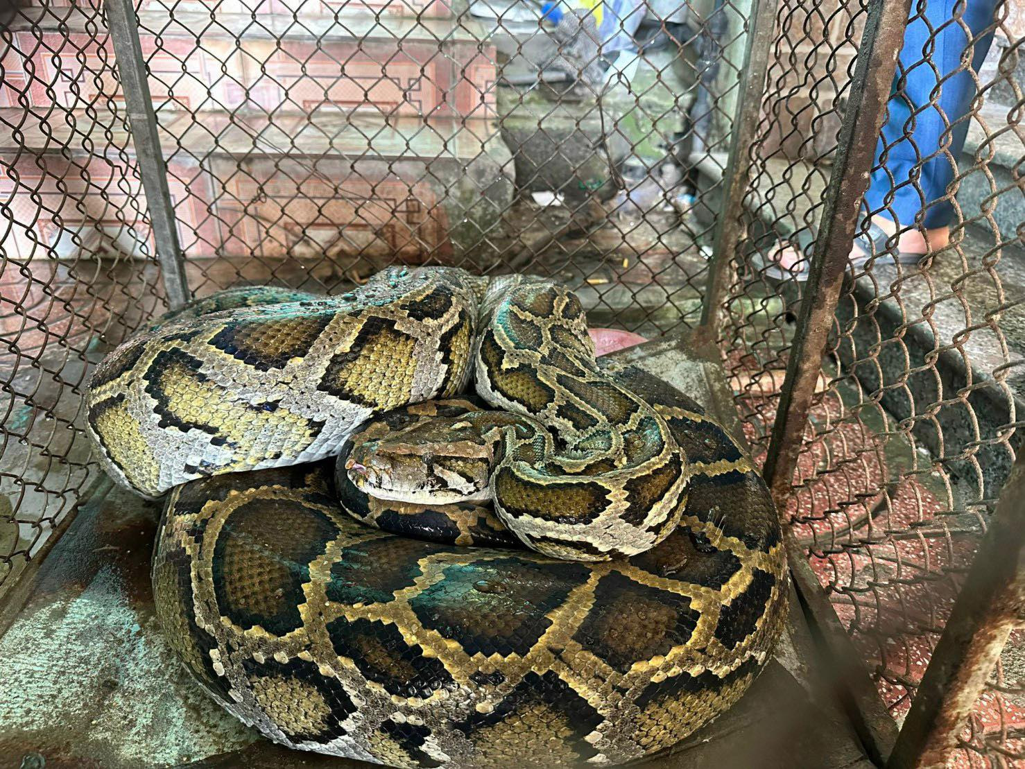 Người dân đã báo sự việc lên chính quyền địa phương và cơ quan chức năng đến hiện trường, phối hợp triển khai bảo vệ, vây bắt trăn nhốt vào lồng sắt.