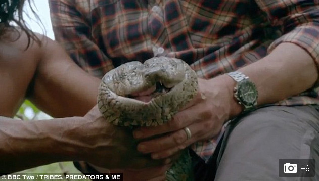 Mọi người đều nín thở, hồi hộp xem người đàn ông dùng tay không tóm đầu, rồi lấy chân đạp vào bụng một con trăn, bắt nó phải nhè ra những con gà đã ăn.