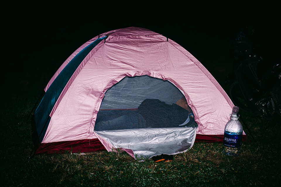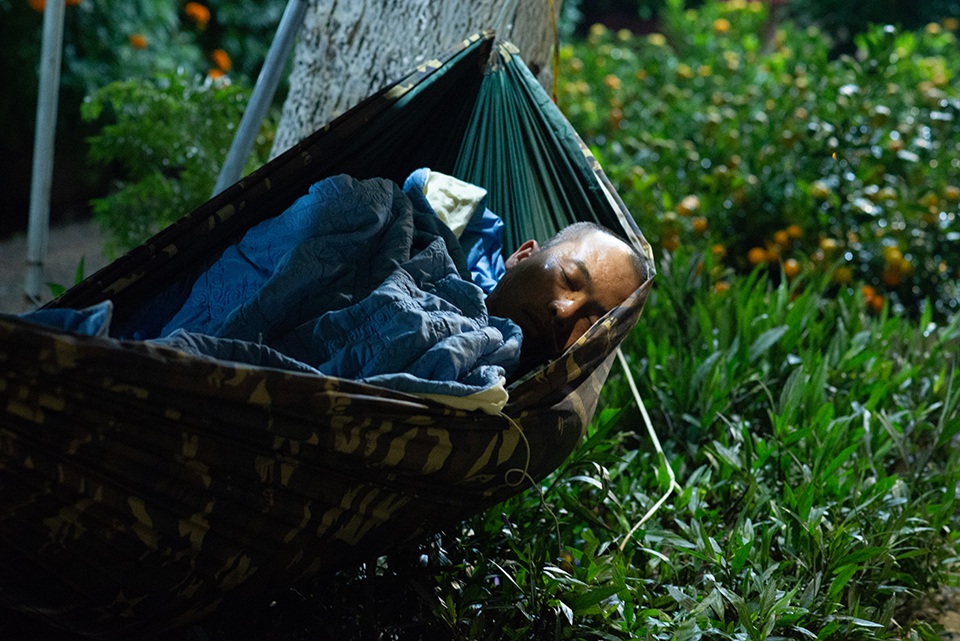Một người chợp mắt giây lát tranh thủ phiên đổi ca trực trên những giường xếp hoặc võng.