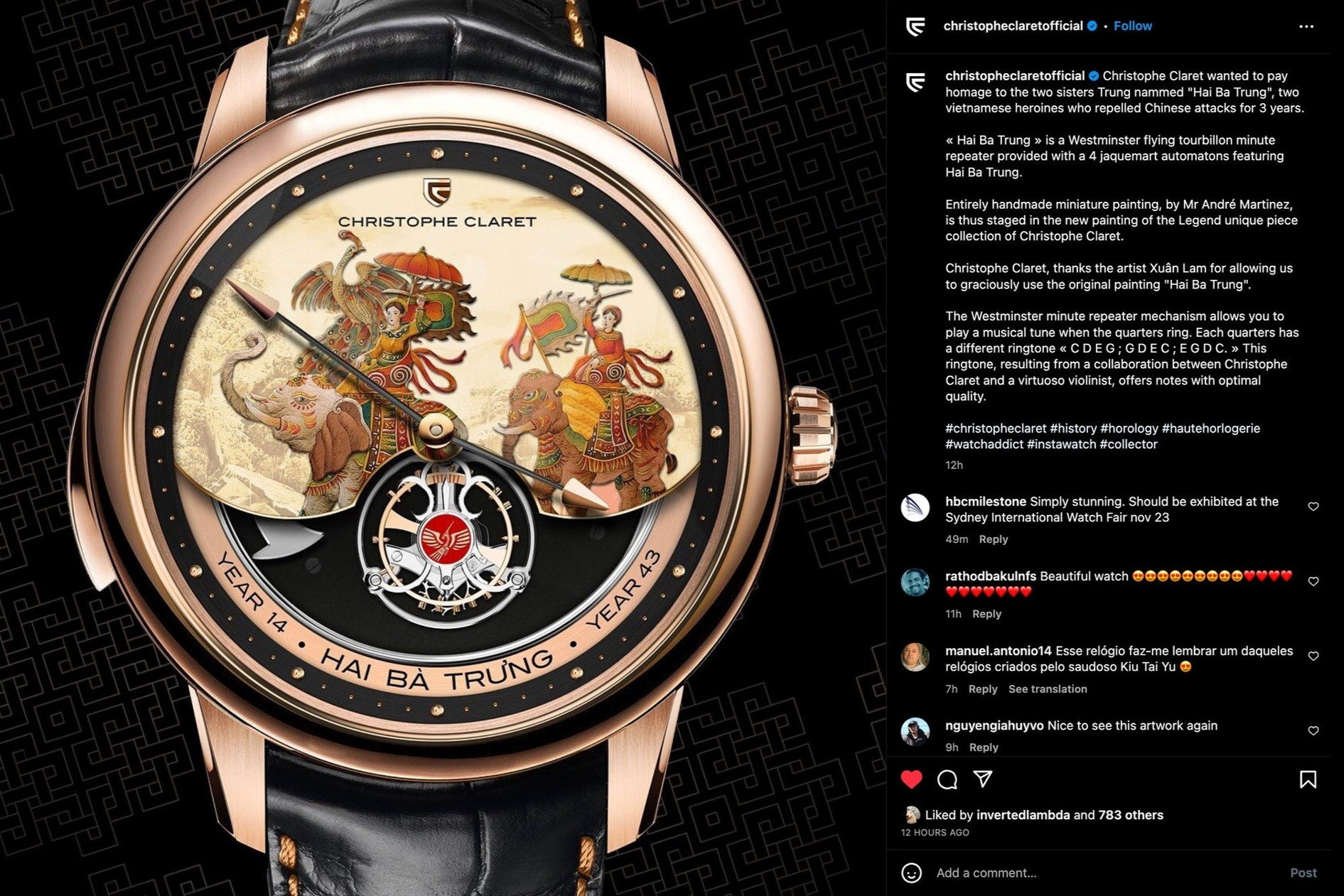 Hình ảnh Hai Bà Trưng trên thiết kế đồng hồ của hãng Christophe Claret (Thụy Sĩ) đã được xác định sử dụng tác phẩm của họa sĩ Nguyễn Xuân Lam từ dự án 'Vẽ lại tranh dân gian'.