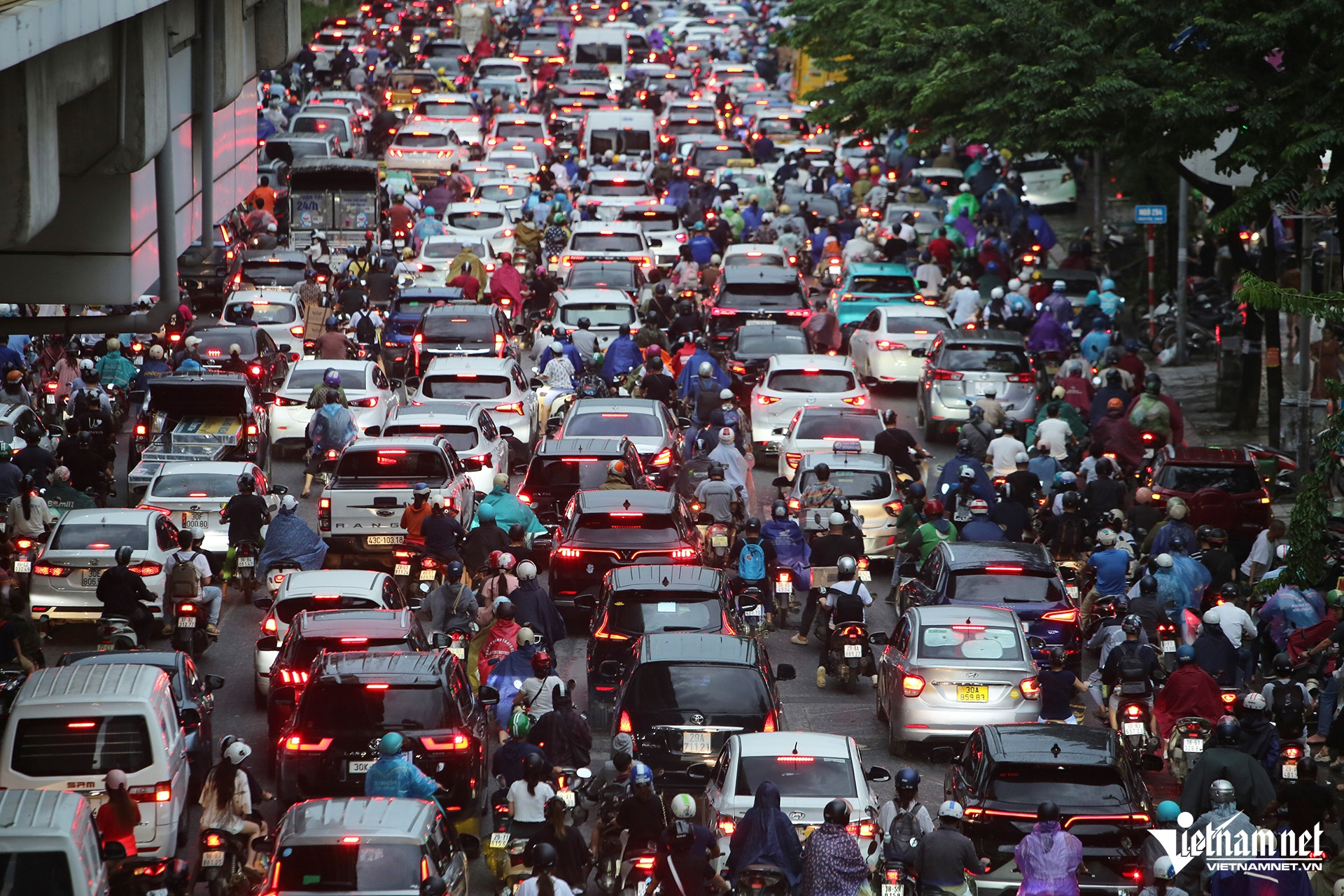 Chiều 6/9, hình ảnh dòng xe cộ nối dài các tuyến đường ở Hà Nội sau cơn mưa giông do ảnh hưởng của siêu bão Yagi.