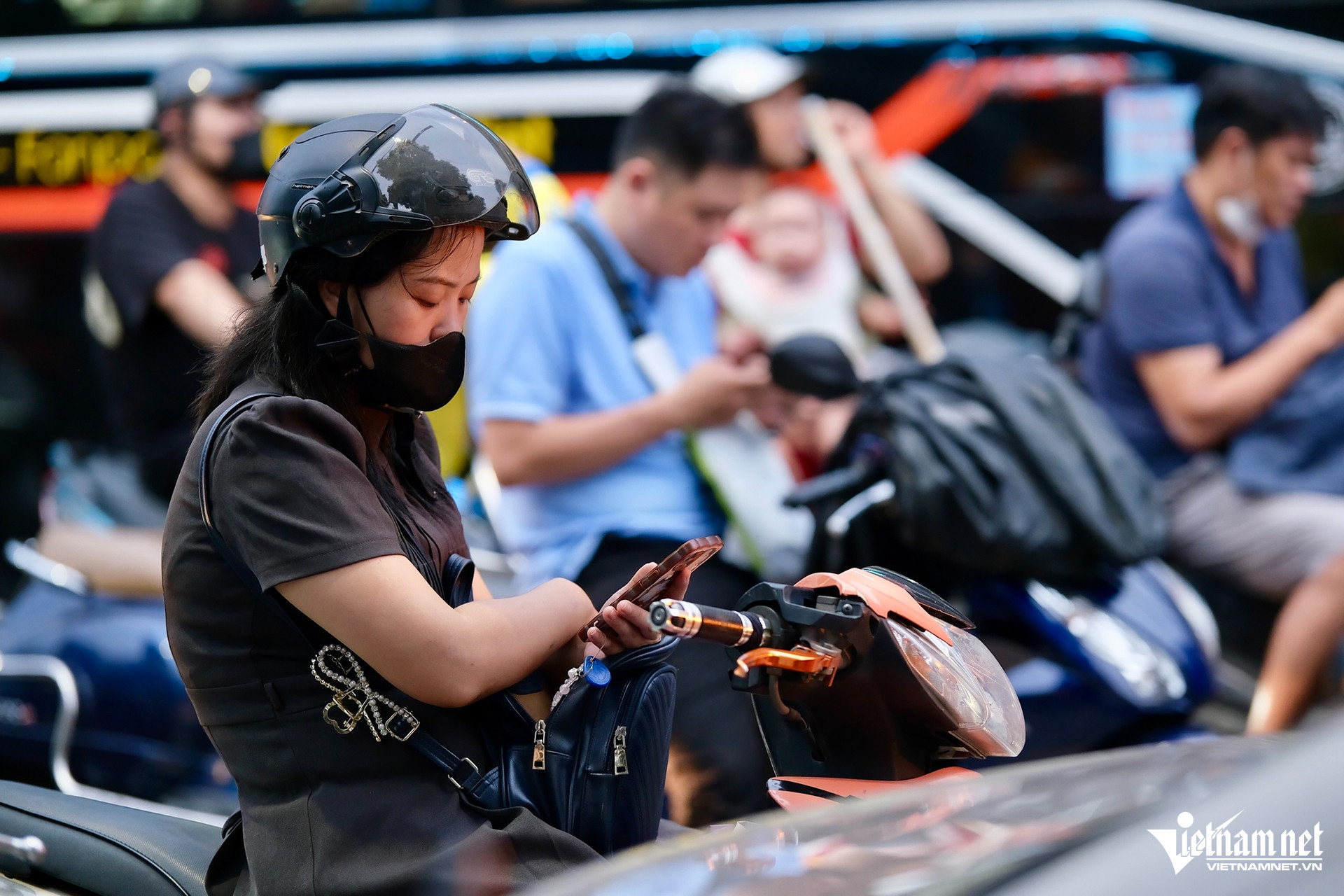 Đường Phạm Hùng (gần nút giao Tôn Thất Thuyết) hàng trăm phương tiện chen nhau nhích từng mét. Nhiều người tranh thủ lúc ùn tắc để đọc thông tin về siêu bão Yagi.