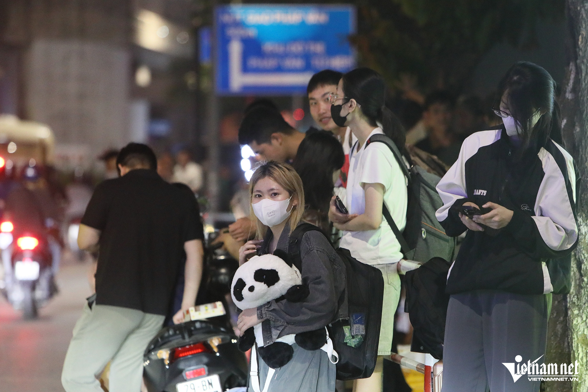 Trước cửa khách sạn Mường Thanh (phường Đại Kim, quận Hoàng Mai), hàng dài người dân vẫn đứng đợi xe khách để về quê.
