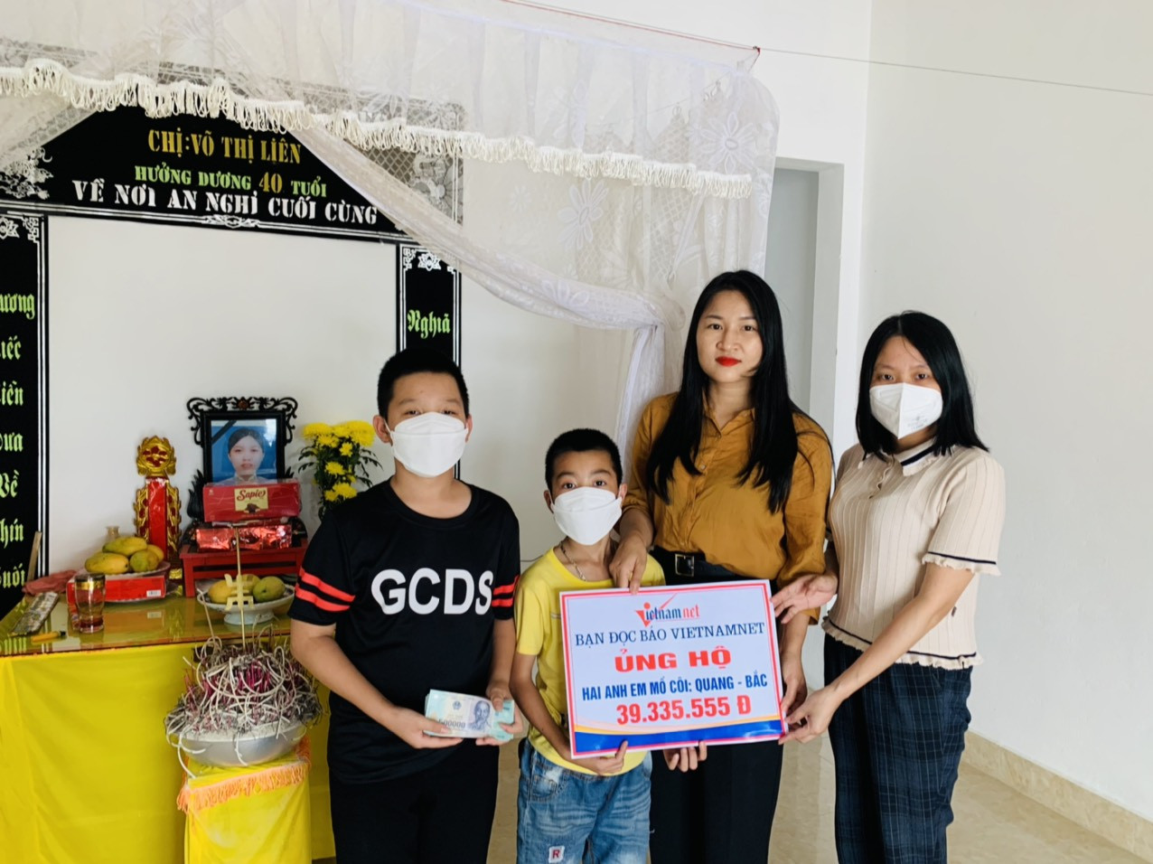 Sau khi Báo VietNamNet đăng tải bài viết: “Hai đứa trẻ khốn khổ khi bố mẹ lần lượt qua đời”, hai anh em Bùi Vinh Quang và Bùi Hoàng Bắc được các nhà hảo tâm gửi ủng hộ gần 40 triệu đồng. Số tiền được Báo VietNamNet phối hợp với phường Đậu Liêu, thị xã Hồng Lĩnh trao tới hai anh em Bùi Vinh Quang và Bùi Hoàng Bắc. Món quà này đã được người thân của hai anh em nhận và làm sổ tiết kiệm cho hai cháu.