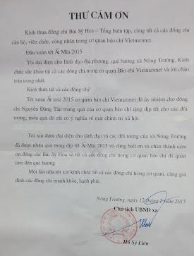 Trước đó, đại diện của báo cũng đã trao 50 suất quà trị giá 15 triệu đồng cho bà con nghèo và các đối tượng chính sách, Thanh niên xung phong thuộc xã Nông Trường, Huyện Triệu Sơn, tỉnh Thanh Hoá. Đây là số tiền trích từ Quỹ bạn đọc của Báo VNN. Sau khi trao quà, báo đã nhận được Thư cám ơn của địa phương về món quà đầy tình nghĩa này.