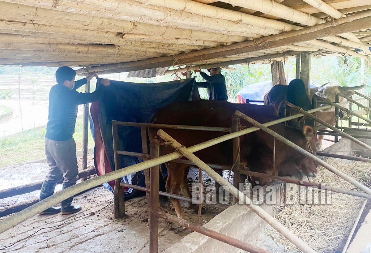 | Người chăn nuôi xóm Tằm, xã Cao Sơn, huyện Đà Bắc, tỉnh Hoà Bình che chắn chuồng trại, cung cấp thức ăn thô, xanh cho vật nuôi trong những ngày rét đậm, rét hại (Ảnh: Báo Hoà Bình) |