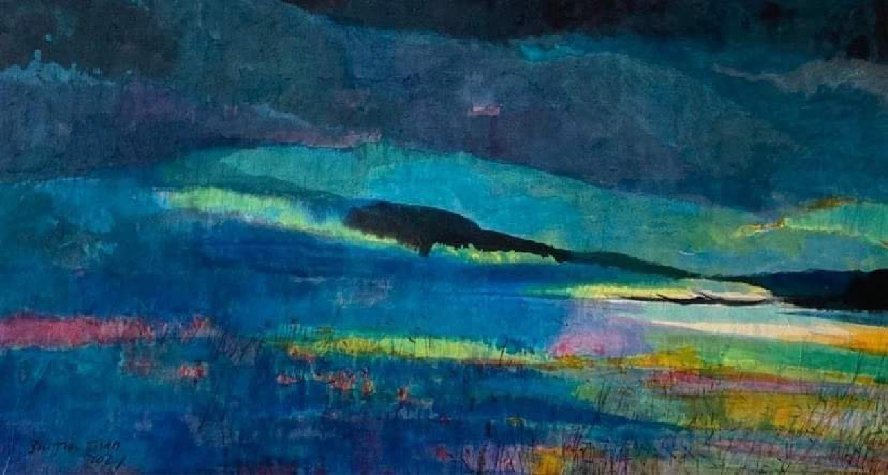Họa sĩ Bùi Tiến Tuấn đang đi công tác ở châu Âu vẫn tham gia triển lãm với 2 tác phẩm để gây quỹ từ thiện hỗ trợ đồng bào Quảng Nam - quê hương anh. Bức tranh màu nước trên giấy dó Dòng sông Thu - trùng tên với chủ đề triển lãm - gồm những mảng màu trừu tượng, hư thực ấn tượng.