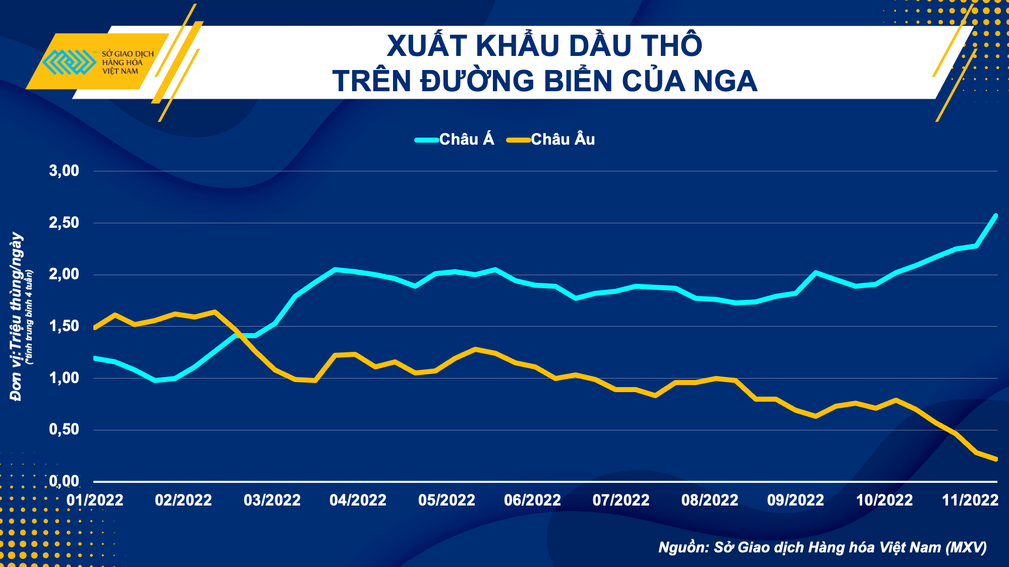 Theo Bloomberg, tính đến ngày 9/12, xuất khẩu dầu thô trên biển trung bình trong 4 tuần của Nga sang các nước châu Âu đã giảm xuống còn 215.000 thùng/ngày. Trái lại, khối lượng dầu thô sang châu Á, cùng với những chuyến hàng trên các tàu không có điểm đến cuối cùng, thường kết thúc ở Ấn Độ hoặc Trung Quốc, đã tăng lên hơn 2,5 triệu thùng mỗi ngày.