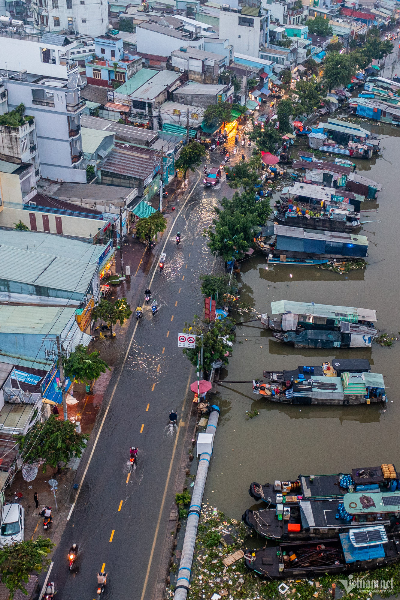 Nước từ miệng cống và kênh, rạch gần đó tràn lên đường vào giờ tan tầm khiến người dân di chuyển vất vả.
