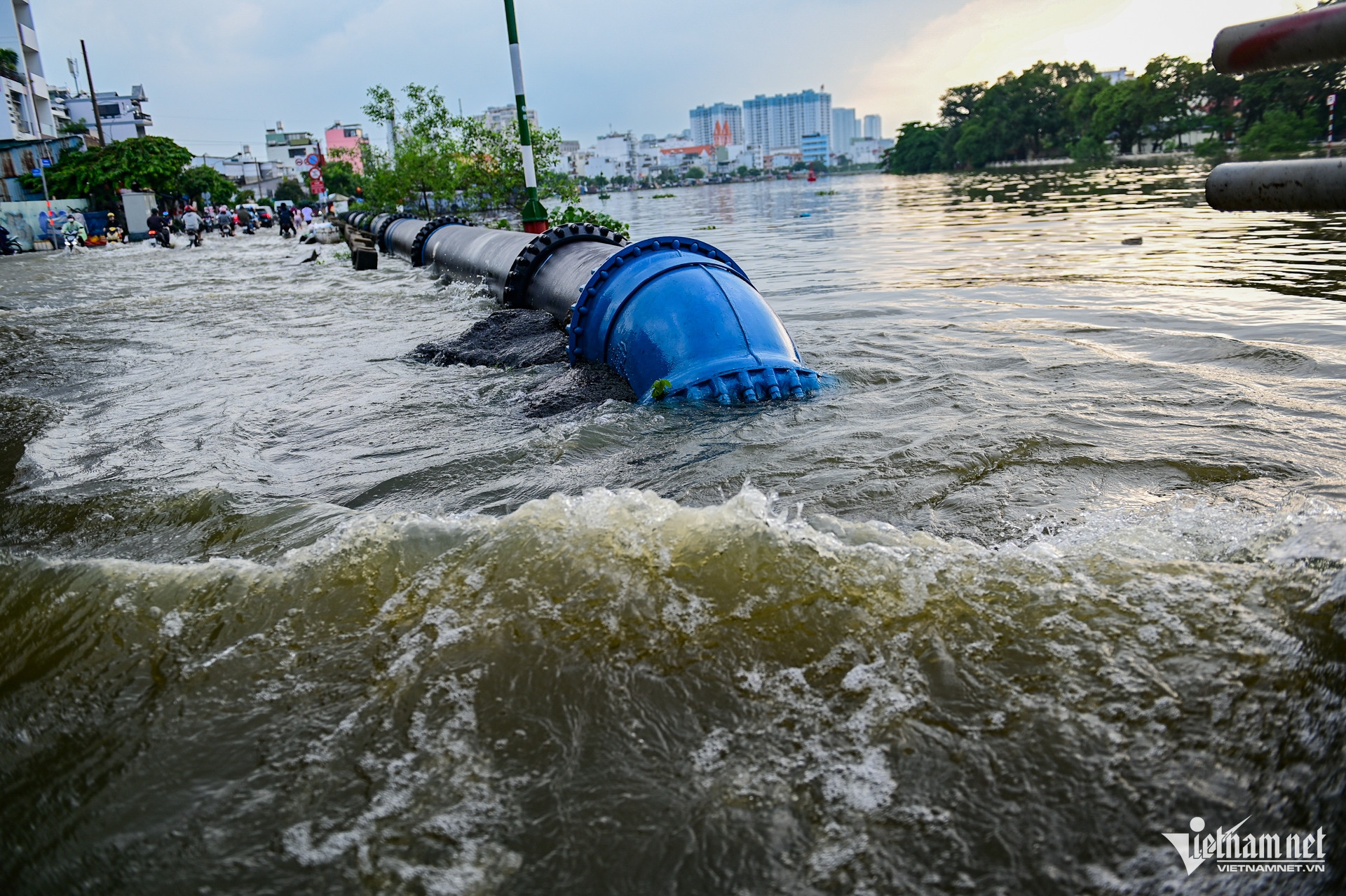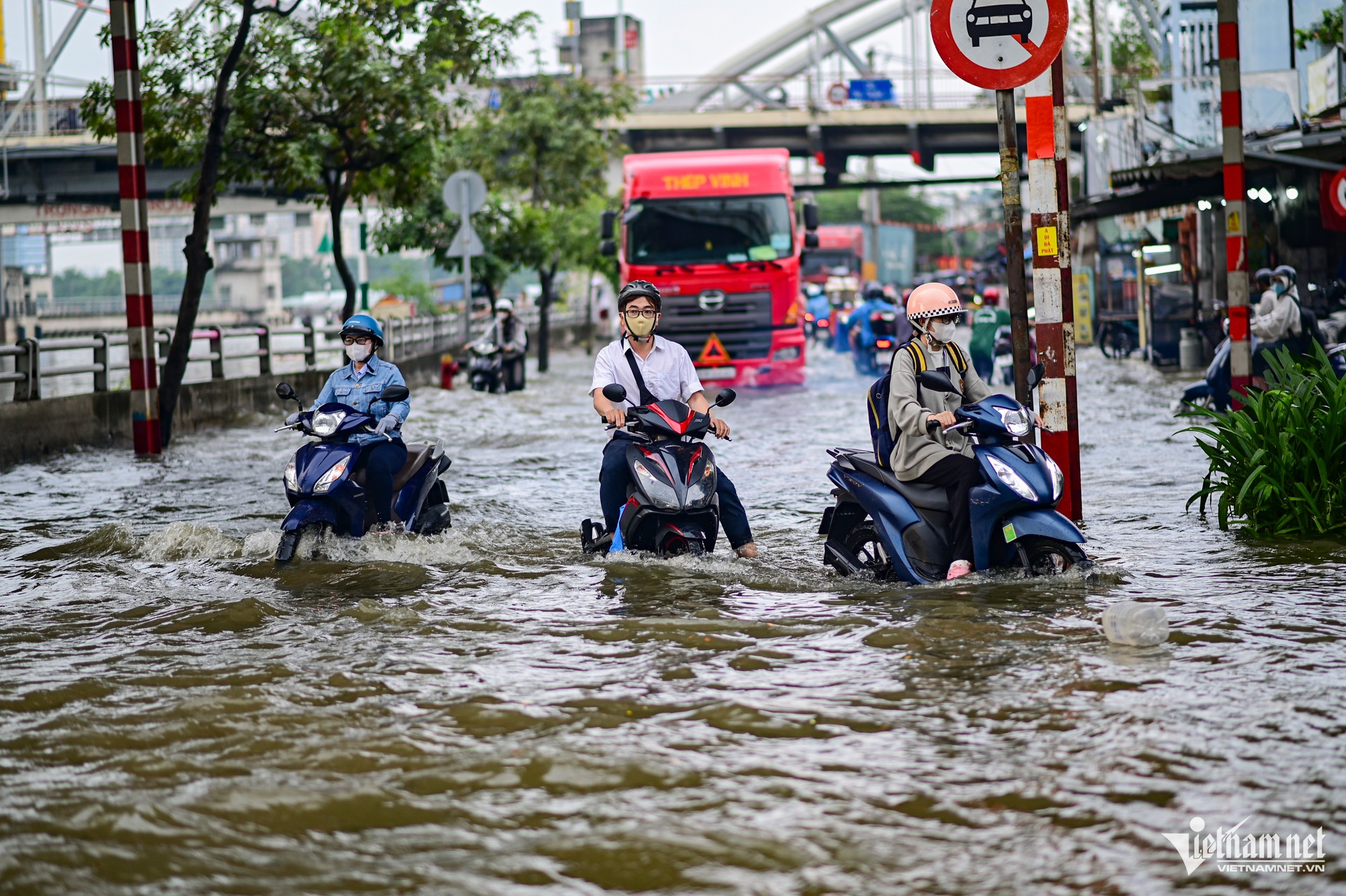 Nhiều xe máy rồ ga cố vượt qua đoạn đường ngập sâu, nước bắn tung tóe, khói trắng phun mù mịt từ ống xả. Không ít xe chết máy giữa chừng, người điều khiển phải xuống dắt bộ, lội bì bõm trong dòng nước ngập ngang bắp chân.
