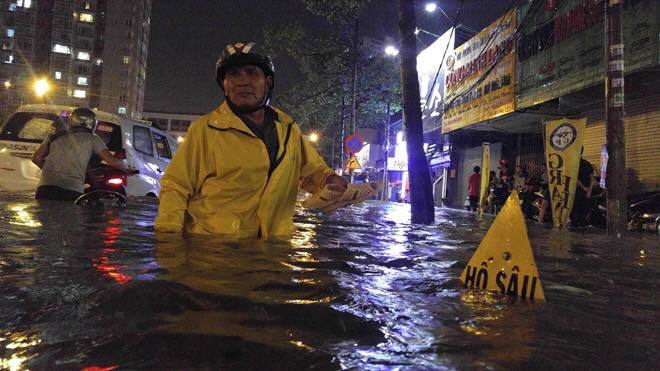 Cơn mưa lớn kéo dài nhiều giờ chiều 16/10 kết hợp với triều cường đã khiến nhiều nơi tại TPHCM ngập nặng.