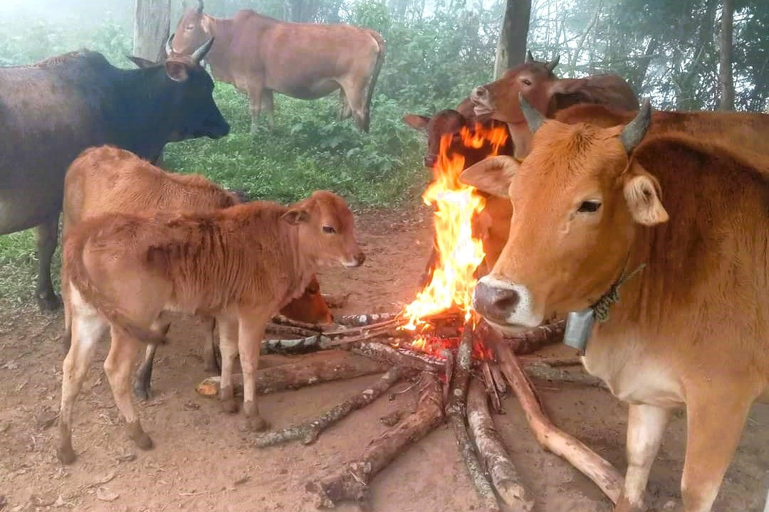 Đốt củi xuyên đêm sưởi ấm cho trâu, bò