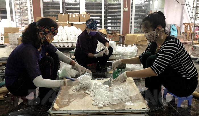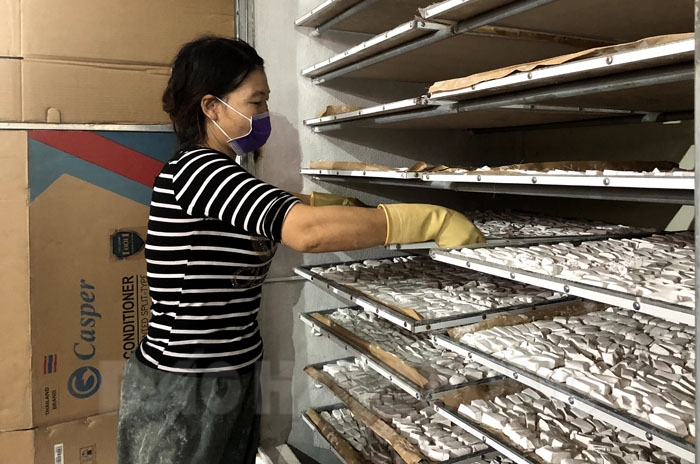 Sấy khô sắn dây tại cơ sở sản xuất của hộ ông Bùi Văn Thành ở thôn Vũ Xá, xã Thượng Quận (TX Kinh Môn). |