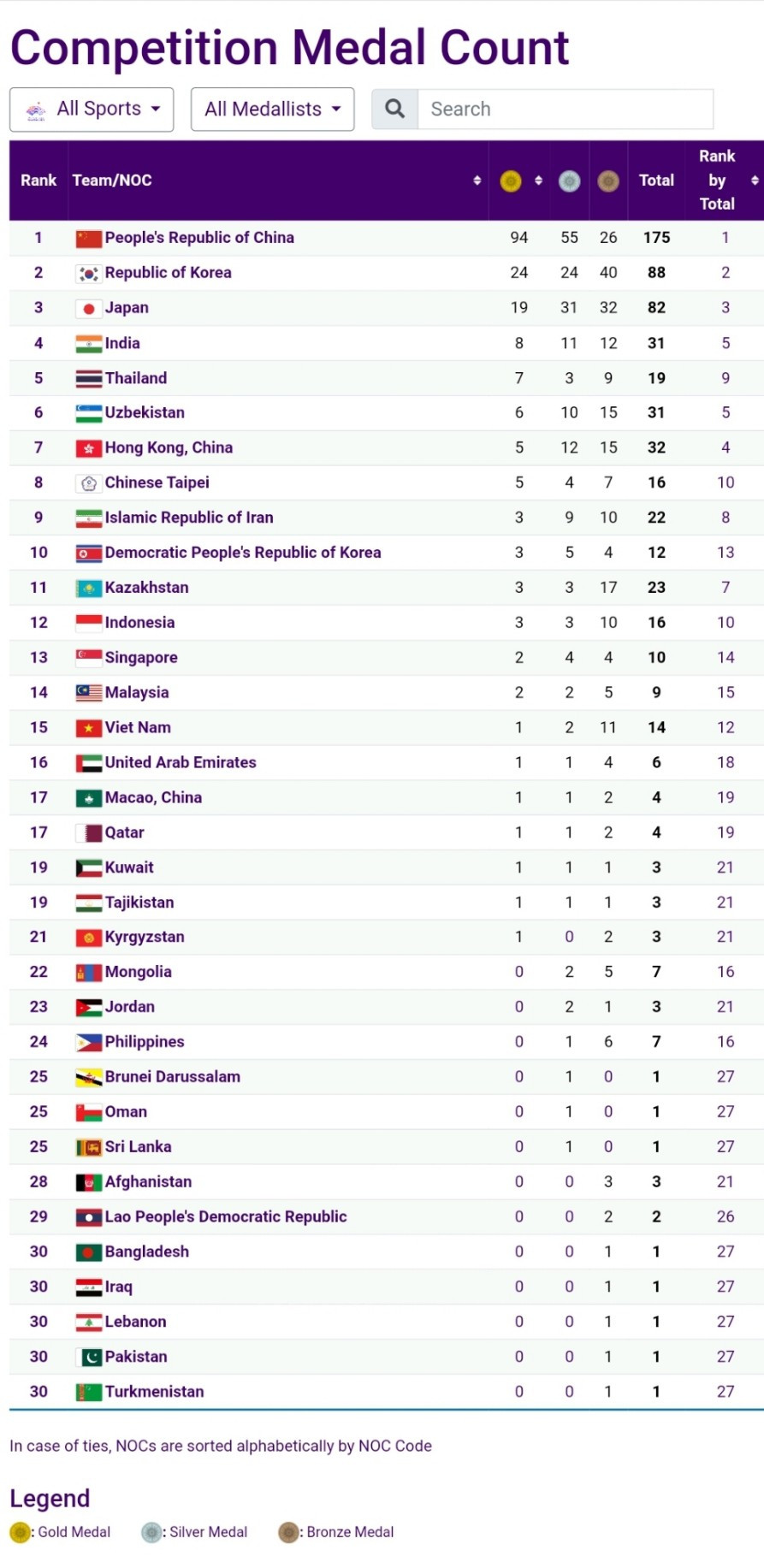 Bảng tổng sắp huy chương ASIAD 2023, tính đến 13h20 hôm nay 29/9