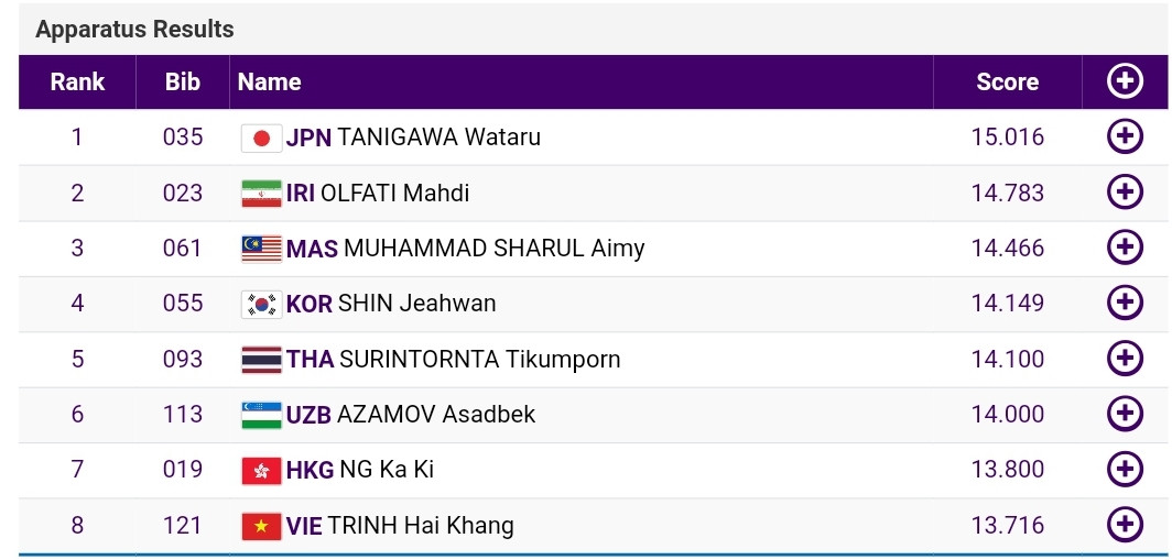 Trịnh Hải Khang xếp cuối nội dung nhảy chống khi đạt 13.716 điểm. HCV thuộc về VĐV Nhật Bản, VĐV Iran giành HCB, còn HCĐ thuộc về đại diện đến từ Malaysia.