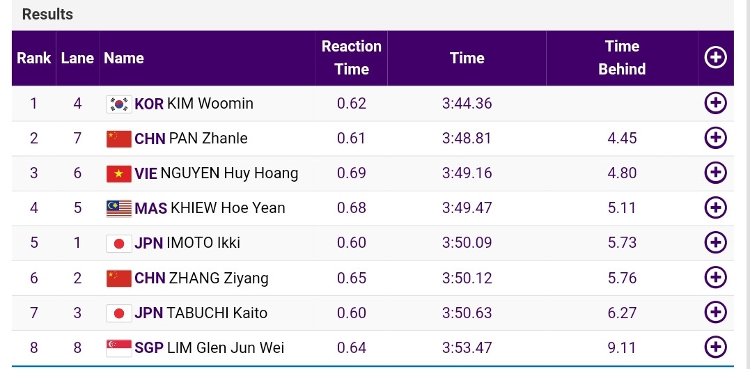 Nguyễn Quang Thuấn cán đích thứ 3 lượt bơi thứ nhất vòng loại 200m bướm với thành tích 2 phút 3 giây 57, không đủ để lọt vào chung kết.