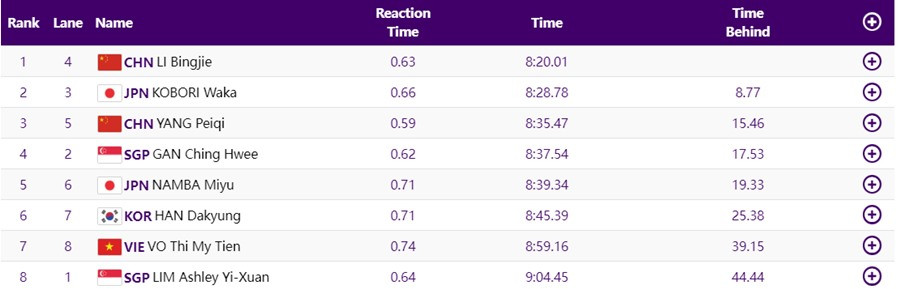 Võ Thị Mỹ Tiên về đích thứ 7/8 VĐV tranh tài ở chung kết 800m tự do nữ, với thành tích 8 phút 59 giây 16. Hai kình ngư Trung Quốc giành HCV và HCĐ, HCB thuộc về VĐV Nhật Bản.