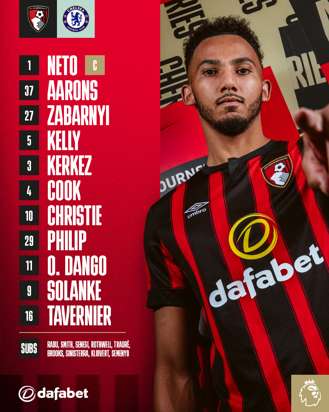 Bournemouth: Neto, Aarons, Zabarnyi, Kelly, Kerkez, Christie, Cook, Outtara, Billing, Tavernier, Solanke.