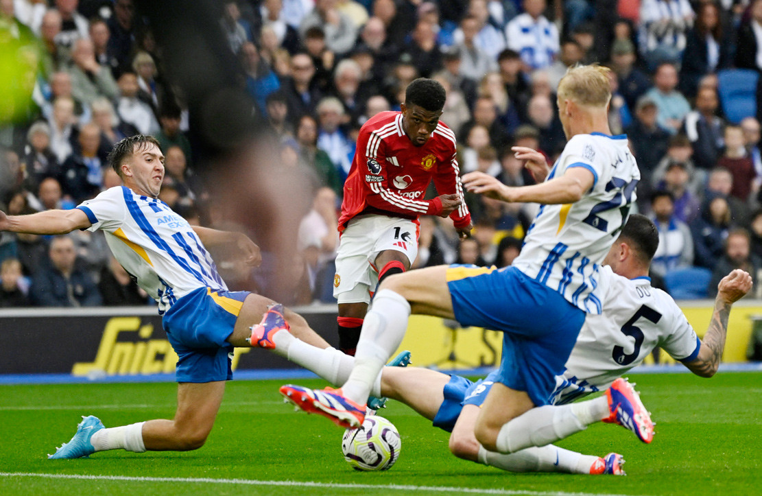Brighton đánh trực diện và Milner băng xuống xỉa bóng qua người Onana. May cho đội khách là Dalot lao về phá giải nguy ngay trước vạch vôi.